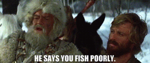Jeremiah Johnson and another man in a snowy setting, with a memorable quote about fishing poorly.