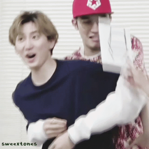 Jesse Kyomoto and a Sixtones member share a playful moment, with one holding the other from behind.