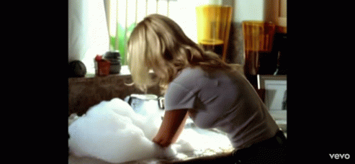 Jessica Simpson washing dishes in a kitchen sink, wearing a white t-shirt with text on it.