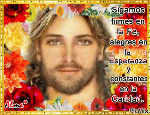 Image of Jesus Christ surrounded by flowers, with Spanish text encouraging faith, hope, and charity.