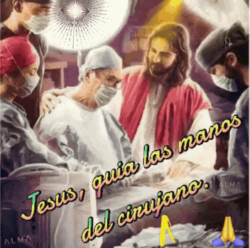 A powerful image depicting Jesus guiding the hands of a surgeon during an operation, surrounded by medical staff.