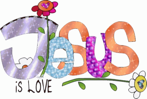 Animated text 'Jesus Is Love' with glitter and sparkle effects, featuring colorful letters and a flower.