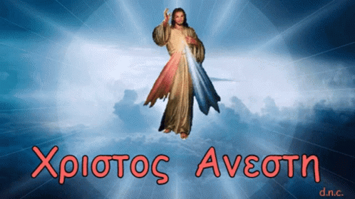 Image of Jesus Christ with rays of light, clouds, and the Greek phrase 'Christ is Risen' (Χριστος Ανεστη).