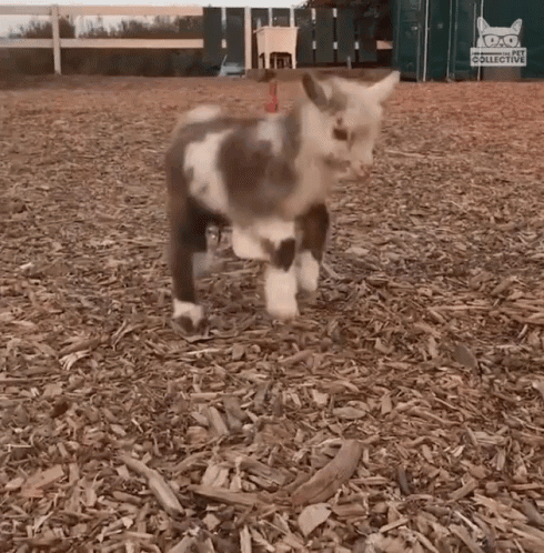 A cute baby goat with brown and white fur playfully runs towards a bottle on a bed of wood chips.
