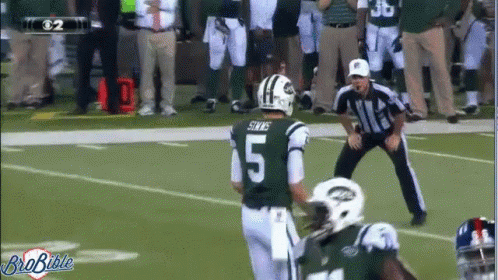 Jets player Simms playfully interacts with a referee on the football field, showing a lighthearted moment.