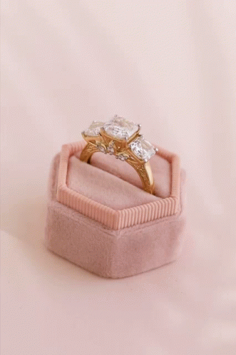 Explore golden deals on a beautiful yellow gold ring with three large stones, displayed in a pink velvet box.
