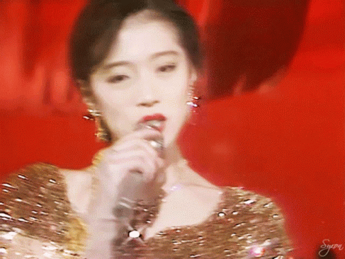 Akina Nakamori delivers a dazzling J-Pop performance, singing and dancing in a sparkling gold dress against a red backdrop.