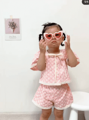 Jian Baby, a little girl, playfully poses with pink heart-shaped sunglasses, standing against a white wall.