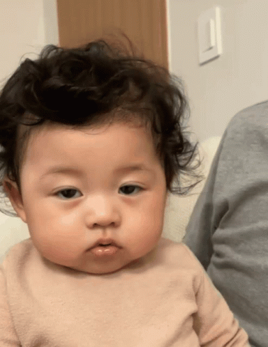 Jian Baby, a cute infant with curly hair, looks adorably sleepy, blinking slowly while sitting up.