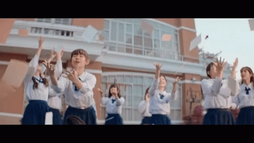 Jib Jibbnk and other BNK48 girls in school uniforms joyfully throwing papers in the air.