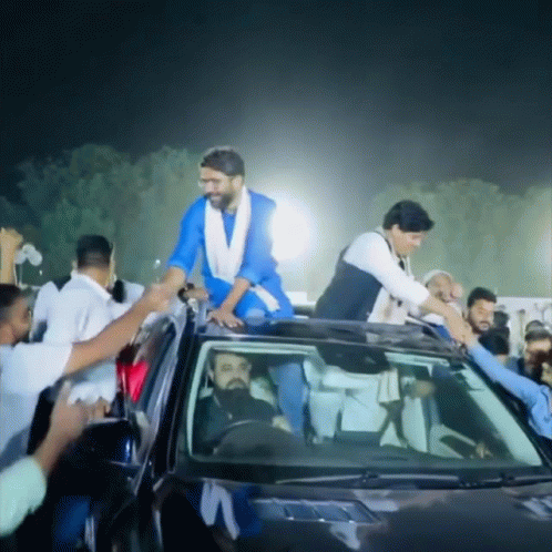 Jignesh Mevani and Kanhaiya Kumar participating in a political roadshow, greeting supporters.