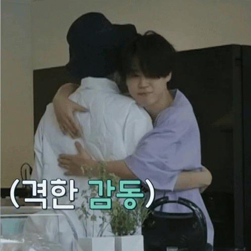 Jimin and J-Hope (Hobi) share a warm, emotional hug, with Korean text indicating deep emotion.