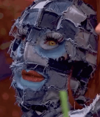 Jimbo from Canada's Drag Race showcases a unique denim patchwork mask with exaggerated eyes and red lips.