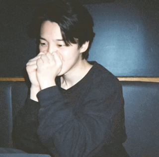 Jimin from BTS playfully covering his eyes and then pointing to his '7' tattoo on his finger.