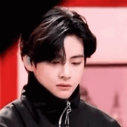 BTS's Taehyung (V) in a black jacket, looking down then playfully peeking with a cross-eyed expression.