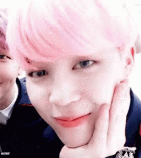 Jiminie Pabo from BTS with pink hair, making a finger heart gesture and smiling at the camera.