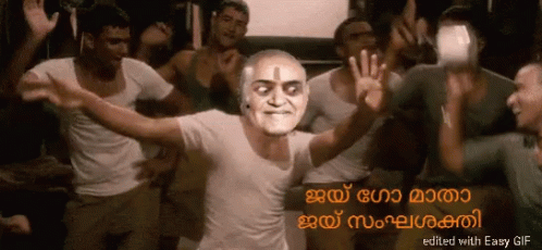 Jimitt leads a happy dance with a group of men, featuring Malayalam captions 'Jai Go Mata' and 'Jai Sanghashakti'.