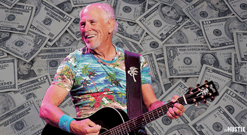 Jimmy Buffett playing guitar in front of a background of US dollar bills, smiling.