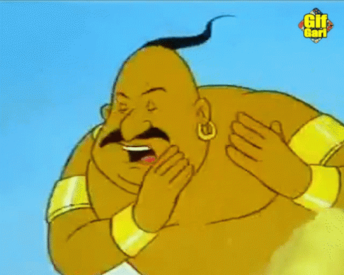 Jin Doitto, the yellow-skinned genie from Meena Cartoon, looks surprised with a worried expression.