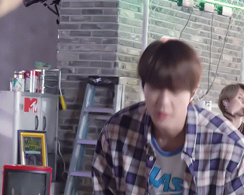 Jin Seokjin in a plaid shirt, making expressive gestures on stage with a microphone.