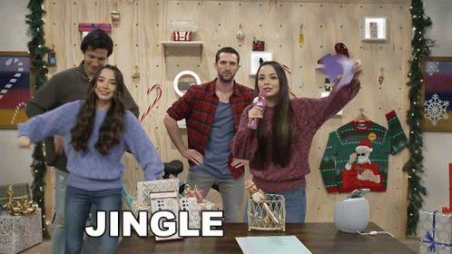 Aaron Burriss, Vanessa Jo Merrell, Veronica Jo Merrell, and John Vaughn sing 'Jingle Bells' in a festive Christmas setting.