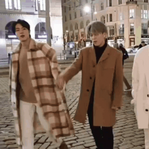 Jin and Jimin of Jinmin walk hand-in-hand down a charming cobblestone street at night, sharing a cute moment.
