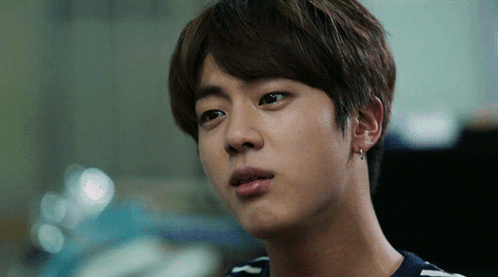 BTS member Jin (Seokjin) makes a playful expression with animated stars and Korean text 'My blood type is a doll'.