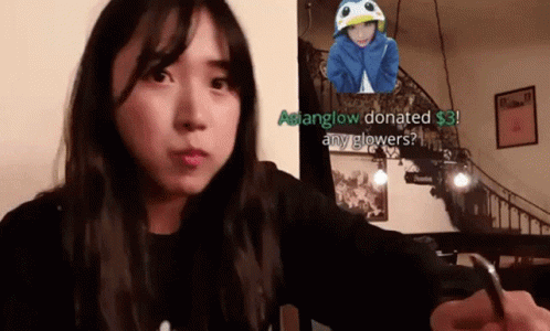 Jinny Jinnytty with full cheeks, eating in a restaurant, reacting to a $3 donation from Asianglow.