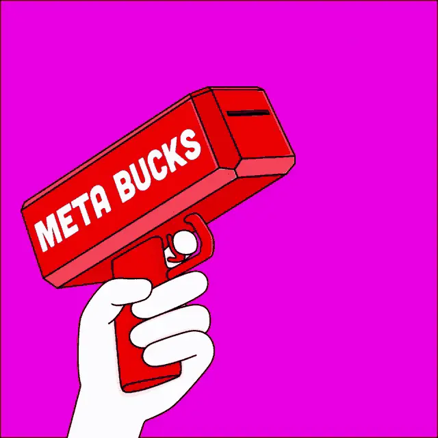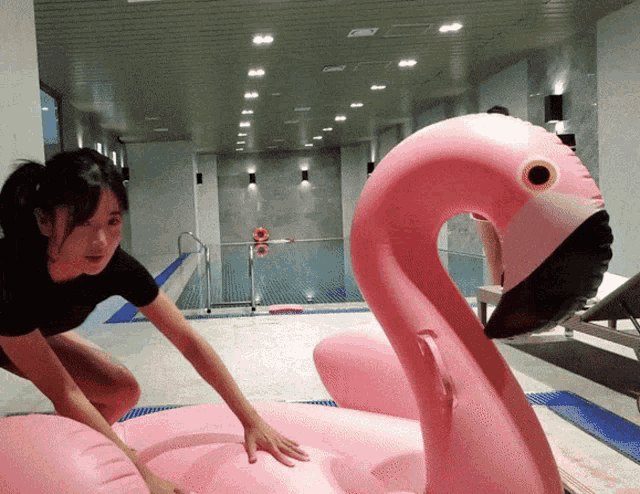 Jinny Jinnytty plays with a large pink flamingo float in an indoor swimming pool.