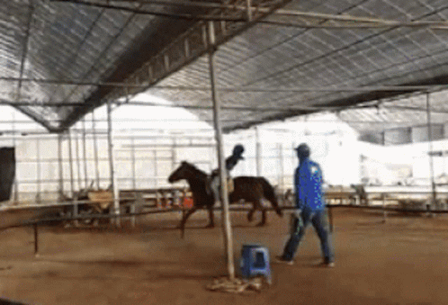 Jinnytty is seen riding a horse in an indoor arena, with a man in a blue jacket nearby.