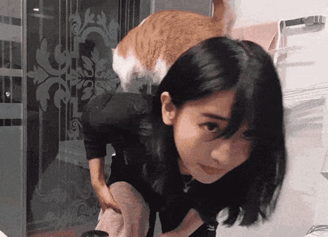 Jinny Jinnytty bends over while her cat, Kiki, stands on her back, looking around the room.