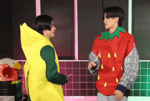Jinwook Kim and another person in fun strawberry and banana costumes, interacting playfully.