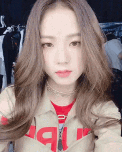 Jisoo from BLACKPINK poses playfully for a selfie, showing off her long brown hair and a stylish choker.