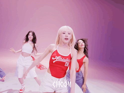 Jiwon from fromis_9 performs a vibrant dance to Supersonic, wearing a red athletic halter top and white shorts.