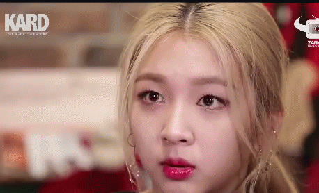 KARD member Jiwoo reacts with a shocked expression, covering her mouth in surprise.