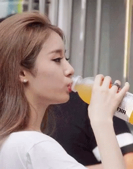 Jiyeon drinking orange juice from a clear plastic bottle labeled 'BIA'.