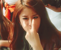 Jiyeon from T-ara playfully makes a 'watching you' gesture, looking directly at the camera with a smirk.