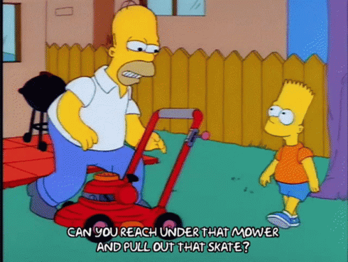 Homer Simpson asks Bart Simpson to reach under the lawnmower to retrieve a skate in their backyard.