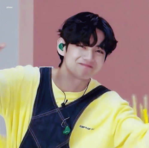 A young man in a yellow shirt and overalls smiles brightly while making a heart gesture with his hands.