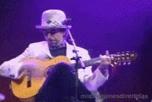 Joaquin Sabina, wearing a hat, plays an acoustic guitar on stage under purple lighting during a live performance.