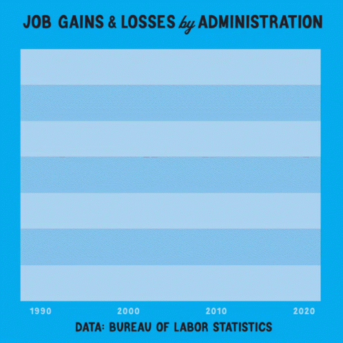 Animated chart illustrating job gains and losses under US Presidents Bush Sr., Clinton, Bush Jr., Obama, Trump, and Biden.