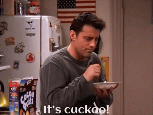 Joey Tribbiani reacts with 'It's cuckoo!' while eating Cocoa Puffs cereal in his apartment.