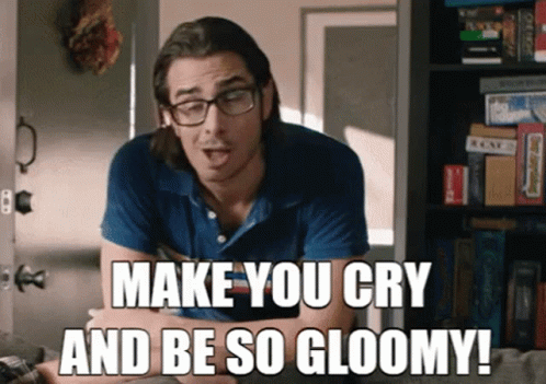 Joey Richter, with a pouting expression, says "Make you cry and be so gloomy!"