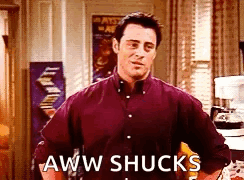 Joey Tribbiani from Friends reacts shyly with a charming 'Aww Shucks' and a smile.