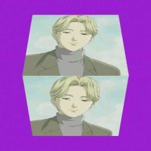 Johan Liebert from Monster featured on a rotating 3D cube, set against a vibrant purple background.