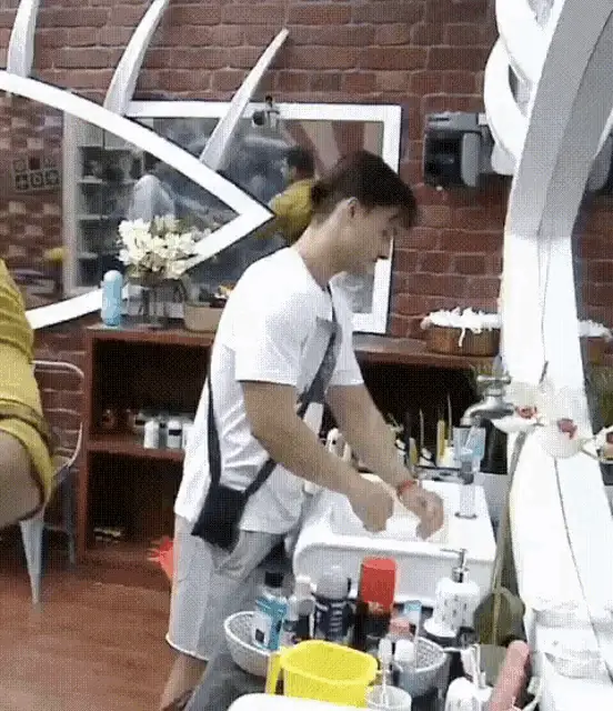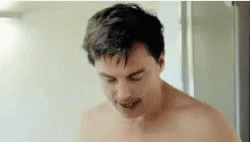 John Barrowman, shirtless, applies shaving cream to his face in front of a mirror.