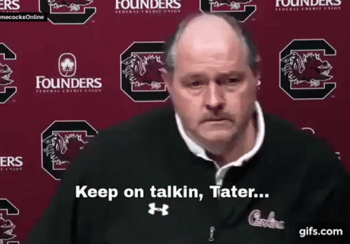 John Evans, associated with the Gamecocks, responds with 'Keep on talkin, Tater...' in a press conference setting.
