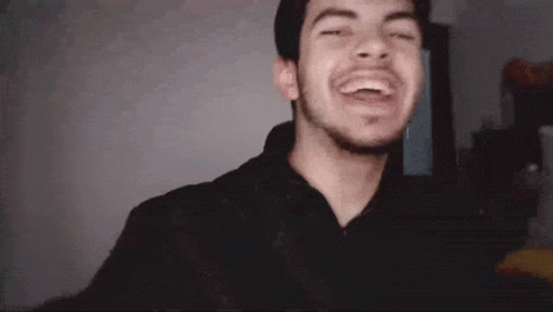 John Underground laughing heartily with his mouth open, wearing a dark cap indoors.