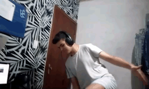a man wearing headphones is dancing in a room with a zebra print wall .
