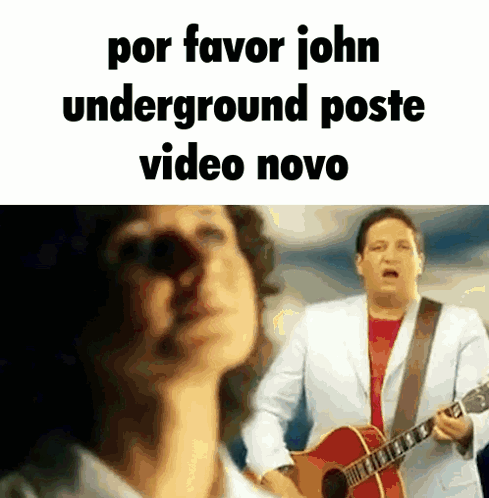 a man playing a guitar in front of a woman with the words por favor john underground poste video novo
